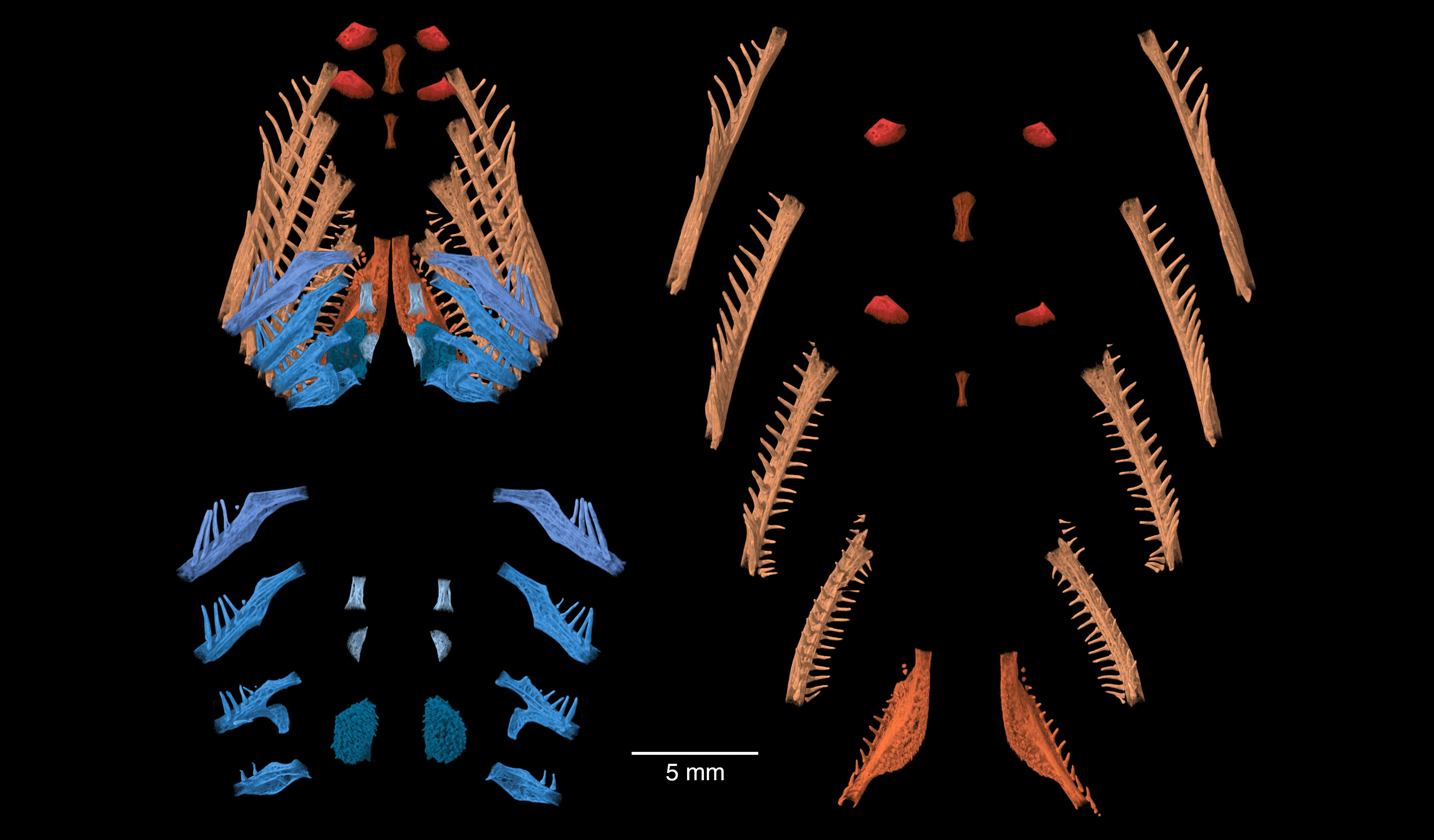 Strange fish live below San Antonio in the biologically diverse, deep pool of the Edwards Aquifer, which provides that city most of its water. One of these fish has a scientific name that starts with “Satan” and is commonly called the eyeless widemouth blind catfish (Satan eurystomus). Its habitat is inaccessible to humans, so specimens of the fish, all collected over 30 years ago, are precious and carefully guarded. A high resolution 3D Computed Tomography scan allowed scientists to digitally extract and analyze details of its skeleton, furthering the knowledge of its evolution, ecology and basic biology. This illustration helps scientists understand how the delicate bones, supporting the species’ gills, function together with its oral jaws for capturing and swallowing prey in the total darkness where it lives. The image was created with a team effort. Dean Hendrickson x-rayed all known specimens, selected the best ossified (Smithsonian specimen USNM 195830), and had it scanned in UT’s Digital Morphology lab. Kyle Luckenbill, Academy of Natural Sciences, Philadelphia, digitally processed the scan data. — Dean Hendrickson, PhD, Curator of Ichthyology in the Department of Integrative Biology.